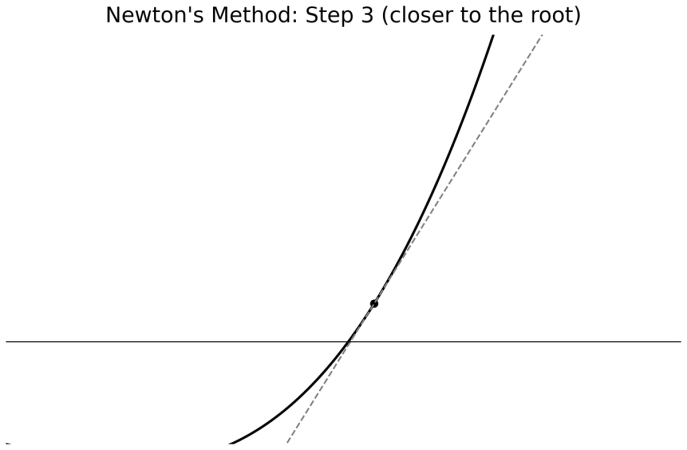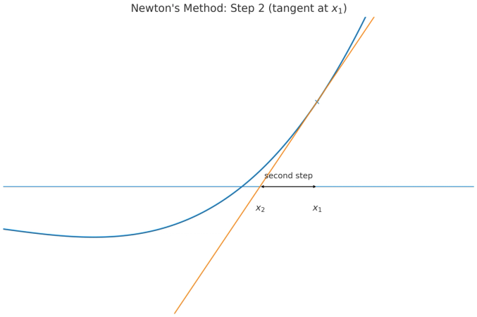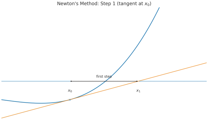 Newton’s methodWe seek a number r with f(r)=0. Starting from a provisional value x0,we replace the curve y=f(x) near x0 by its tangent line. The tangent at x0 has equationy−f(x0)=f′(x0)(x−x0).Imposing the x-axis condition y=0 gives 0−f(x0)=f′(x0)(x1−x0), hencex1=x0−f′(x0)f(x0).Repeating the same construction at x1, then at x2,and so on, yields the iterationxn+1=xn−f′(xn)f(xn).This update is precisely the solution of the linear equation f(xn)+f′(xn)(x−xn)=0,that is, the x-intercept of the tangent drawn at (xn,f(xn)).The construction is local, depending only on f near the root. If f is differentiable at a simple root r with f′(r)=0 and the start is close,the iterates converge rapidly; the tangent error is quadratic in the step.Caution: if f′(xn)=0 the step is undefined; if ∣f′(xn)∣ is small, the step may be too large. Far from a simple root the tangent may cross poorly,causing divergence.In practice one monitors ∣f(xn)∣ or ∣xn+1−xn∣ and stops at tolerance. If overshoot occurs, use damping:xn+1=xn−λf′(xn)f(xn),0<λ≤1.