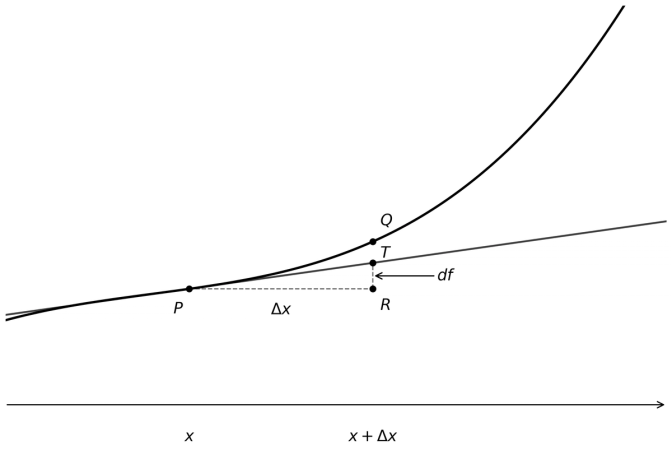 The image above depicts the df infinitesimal change (RT) on graph which approximates to the ∆y change (which is RQ) for sufficiently small "∆x" (PR) changes.